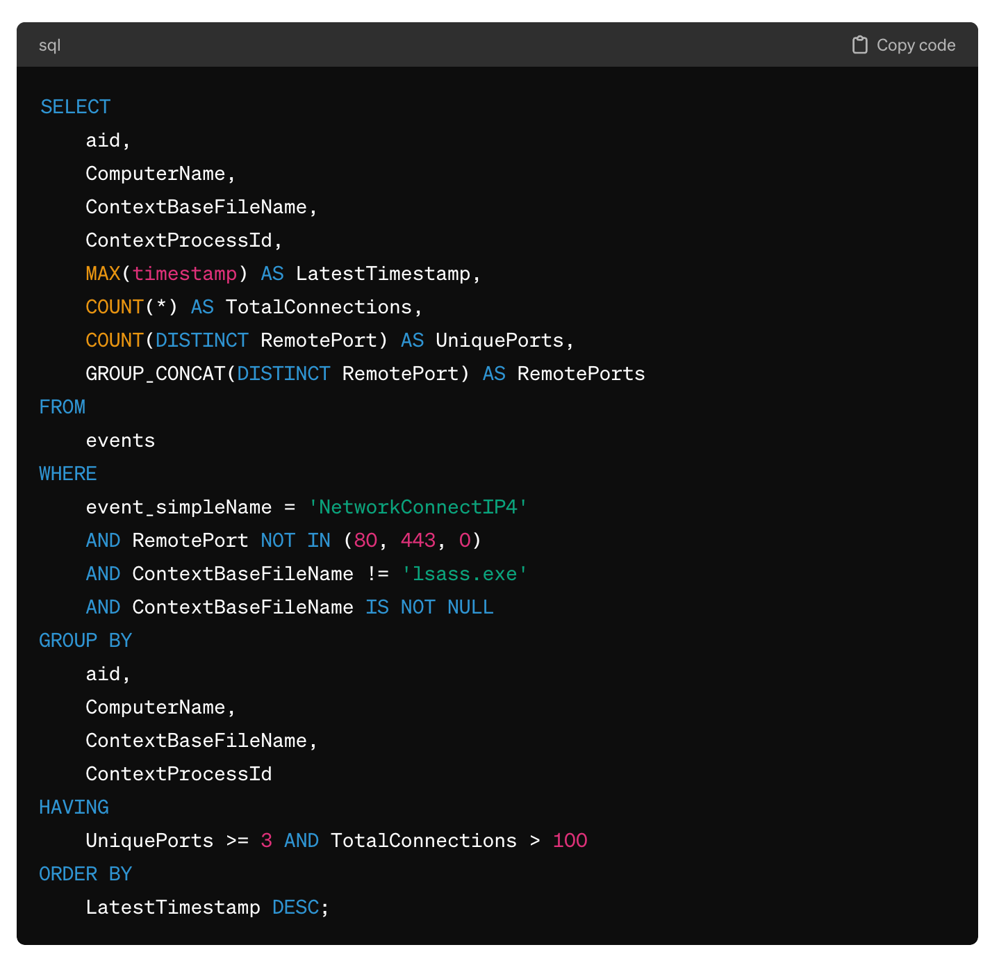 The query above combines the two previous queries into multi-dimensional detection logic. A platform like Anvilogic that supports SQL JOIN operations could be used to operationalize these rules by automatically adding the necessary time windows, scheduled execution, and version control.
